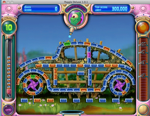 What exactly is Peggle? Well, it is a little hard to describe, but I’ll do my best. On the Peggle screen you have pegs and bricks that come in a variety of colors. The colors include orange, blue, green, and purple. Your goal is to hit all of the orange ones so that they disappear. The purple pieces give you more points (important for extra balls) and the green pieces have special powers-ups (which vary on the different levels).
