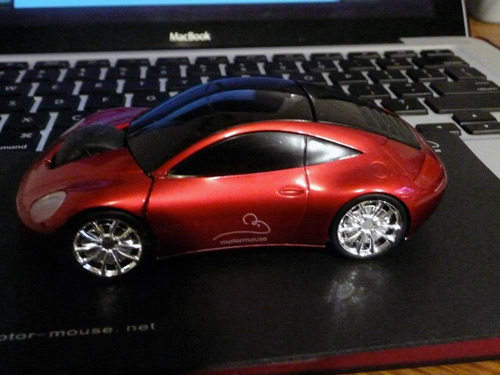 But Motormouse wants to change all that. Now you can put a sports car on your desk, and while you drive it around your desktop, it drives your mouse pointer around the screen. Motormouse is a well crafted classic sports car design with a lot of excellent detail. When you insert the batteries for example, the front and back lights flash, reminding one of unlocking a car with the remote. The paint finish, which comes in red, black, silver, and blue is a high quality metallic paint, and the chrome wheels add a nice sporty touch as well. This little gadget just looks cool sitting on the desk, and most people will not even know it is a mouse.