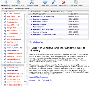 Bottom Line: NNW is extremely useful, easy to use and simple to set up, all in all a great way to add functionality to your Mac. NNW also excels at following blogs, blogs are possibly the most uneven form of internet publishing, a crap shoot of content. NNW allows you to skip “Wow, I just learned to dislocate my finger at will” while reading “This is the Mock Up of the New iMac i was Contracted To Do”. I’m not sure which is worth more: finding the really good stuff or avoiding the really bad stuff, either way NNW is worth the cash outlay.