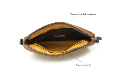 The Abby iPhone Case has an ultra suede iPhone pocket, a removable leather shoulder strap and self-locking YKK, a premium zipper known for its durability. Other quality features include finished seams, a feature that prevents unraveling, interior gold lining for visibility, and leather accents. As advertised, I was able to use earbuds to handsfree talk while my iPhone was stored in the purse. The small Abby iPhone Case can be stored in larger bags or backpacks. It can also be carried as a stylish clutch by removing the leather strap.