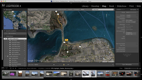 The map module also offers a very elegant way to geotag your photos that do not have GPS information in their metadata. You can search the location in the search field in the top right on the module and zoom-in to the specified location. Then, you simply select a set of pictures from the filmstrip at the bottom and drop them onto the map.