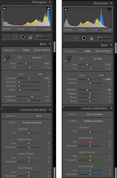 In Lightroom 4.0, Adobe introduces a new process, named 2012, vs 2010, that changes the sliders’ names and behavior in the Basic panel. Personally, I find the new sliders more intuitive to work with. The Highlight and Shadow sliders are very much like the ones present in Aperture, something that the Fill Light slider never really accomplished well in the old process. The 2010 process is still available if you prefer it, but you should give a chance to the 2012 process first.