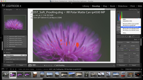 Soft proofing is a way to mitigate this process by letting Lightroom tell you which color gamut may not print. In the View menu select Soft Proofing/Show Proof (or press the shortcut S) to enter this mode. From then, the histogram will be replaced by a Soft Proofing histogram and an overlay on the picture will show Proof Preview. Choose the ICC profile you want to work with, then click the Destination Gamut Warning icon in the top right corner of the histogram. This icon asks Lightroom to show you the gamut warning; red spots on your image indicate where colors will not print as the one you see on screen.