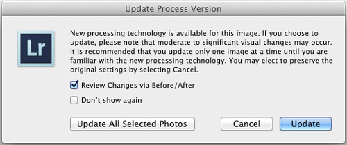 If you select a picture that is not developed with the new process, a warning square with an exclamation mark will appear on the bottom-right of the picture. If you click it, you will be invited to change the process to the current one, and be offered to see a before and after view.