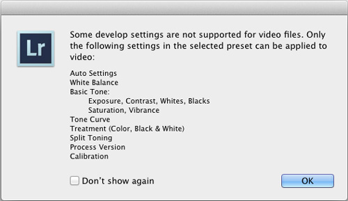 Video clips are not supported in the Develop module, but you can change a clip’s appearance in the Library module with the Quick Develop settings. When doing so, Lightroom will tell you that only some attributes can be changed in video clips; not all the options are available in the Develop module. Lightroom does not have the capability to do linear video editing; that is, you cannot take many clips and make a movie from within the application.
