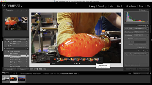Lightroom 3 was capable of importing video into its catalog. But with new cameras and DSRL that can shoot video, Adobe had to do better. Lightroom 4.0 delivers some new features for video management and modification. In the Library module, a video thumbnail will show the length of the clip in the lower right corner.