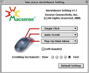 Here is a look at Macsense’s AeroMouse Setting control panel in OS 9, with my preferred settings for the two buttons and scroll wheel.