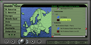 For me, being able to think “Chicago = WFMT for classical music” or “England = BBC Radio 4 for sophisticated talk” or “France = LCI Live for French television” is a delight. Add the Tuner’s other features and it’s easy to recommend you consider downloading and evaluating it prior to purchase. Aladdin Systems has had a few inferior products over the years, but not many. I look forward to using an improved and expanded Aladdin Tuner with my iMac/SprintBroadband connection.
