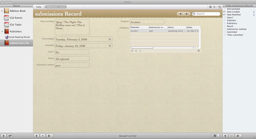 It’s much closer to Pages, Numbers, iPhoto, iTunes in feel and scope than it is to FileMaker. But prolonged use for this review has revealed that Bento can easily be made to do more than might be apparent even from glancing familiarity with the delightful sophistication of the interface.