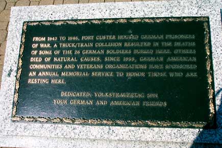 Plaque reads: From 1943 to 1946, Fort Cuter housed German Prisoners of war. A truck/train collision resulted in the deaths of some of the 26 German soldiers buried here. Others died of natural causes. Since 1953, German American communities and veterans organizations had sponsored an annual memorial service to honor those who are resting here. Dedicated: Volkstrauertag 1994. Your German and American friends.