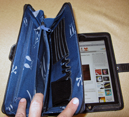 Made of genuine leather with a micro fiber lining that covers the case surfaces that come into contact with the iPad, the Wallet also provide additional zipper-able section that gives the user the capability to place an iPhone, credit cards, business cards, pens and other small items inside; plus there are two more zippered sections that one can store the earphones for the iPad and other items that one may want to have close.
