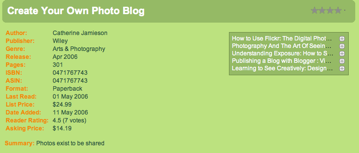 Like Delicious Library, Bookpedia also uses Amazon.com and over 10 other international search sites to find the book you’re wanting to input. You simply put in the ISBN number for the book and it does the search. You can type in the number by hand or use Apple’s iSight or a digital video camera to scan in the books you already have on your shelf. But what else is great is that when you click on a book in your collection and get it’s metadata, you also get a list of other books that are similar to it. This nice short list feature provides a way for you to quickly add books to your wishlist or books that you already have in your library without having to input the ISBN number.Â