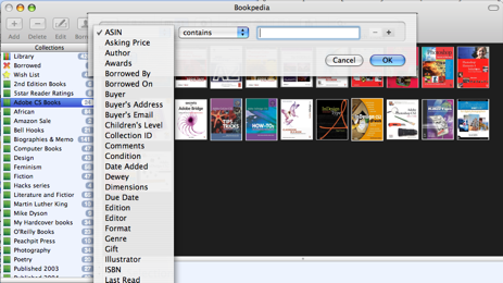 Bookpedia offers a couple of dozen criteria for creating smart collections. Folders can be based on genres, an author’s names, publication date, ISBN number, and even custom criteria that you input into the system. These smart collections are automatically updated as you import new books that fit a collection’s criteria. So for instance, I have a smart collection that holds all the books I have or want that were published this year. This folder is updated each time I add a book that fits that criteria.Â