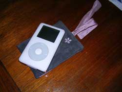 As far as features go, these covers adopt a minimalist approach. They aren’t toys for geeks, and what you get is a padded suede pocket embroidered on the outside with the design of your choice. The suede is durable and easily thick enough to keep the iPod from being scratched. It is sized to be a very slightly tight fit, so that the iPod is held in place. A silk ribbon forms the tie that stops the iPod sliding out, and if you need to see the iPod screen or press any of the iPod’s buttons, you’re going to need to open the ribbons and slide the iPod out. Bottom line, these covers are really for lightweight use, and I wouldn’t use one while cycling or playing sports, where one of the more heavyweight iPod covers would make better sense.