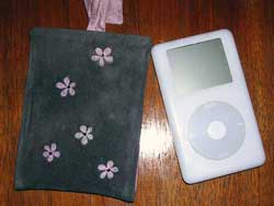 OK, now to the specifics: the iPod cover I ordered was charcoal grey with lilac trimmings cut to fit a fourth-generation iPod. Bridget Davies does have a web site, but ordering is done by e-mail. Prices include delivery within the UK, but she will ship internationally though postage will add slightly to the final price. I got my iPod cover within two weeks of ordering, but since these are handmade items made to order, you probably want to place your orders as soon as possible.