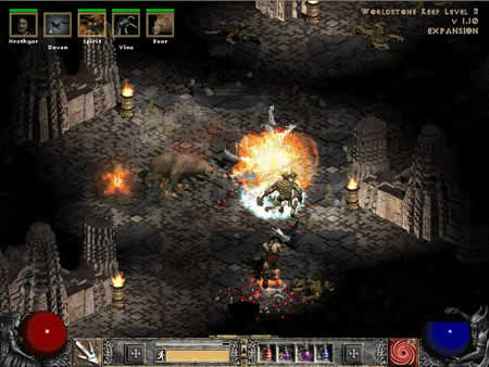 Essentially, Diablo is a sword-and-sorcery action game in which the player combats the forces of evil using various combat and magical abilities, depending on the character class he or she chooses to use. Druids, for example, can call upon the forces of nature and have wolves and bears fight alongside them, while rogues use their skill with the bow to shoot down enemies from afar. With each new skill level earned, the player gets points to improve existing skills or add new ones, and since each character class has lots of possible skills, the player has plenty of scope for customizing their characters. But at the same time as the player progresses through the games, the monsters get ever more numerous and difficult to beat, and if you spread your character development points across too many skills, then none of them will be strong enough to help you defeat the toughest monsters in the game. To be successful then, the player must plan ahead, concentrating on certain sets of skills to specialize their character in a certain way.