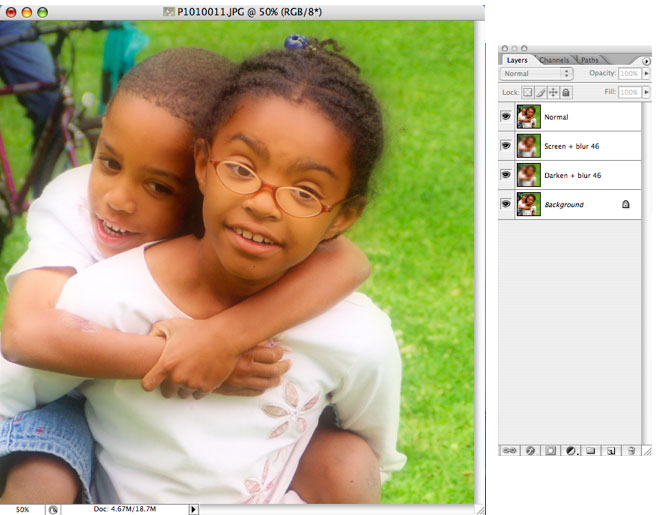 This Soft glow blend was done simply by making three layer copies of the original photo and adding darken and screen layers (again, blending modes), plus a mix of Gaussian blur for the soft focus effect.