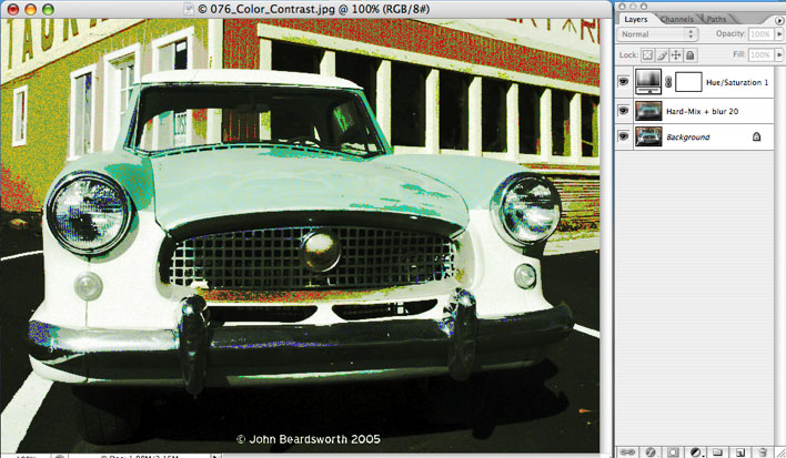 Again, it’s just means adding a mixture of Hard Mix, a little Hue/Saturation adjustment, opacity reduction, and a drop of blur to soften the effect. This would make for a very useful illustration in a magazine.