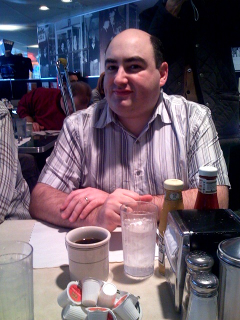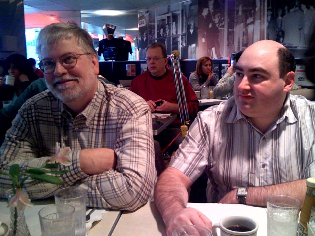 Next we have Larry Grinnell, David, and a bystander in a red shirt who isn’t sure he wants his picture taken in a restaurant with a bunch of Mac fanatics!