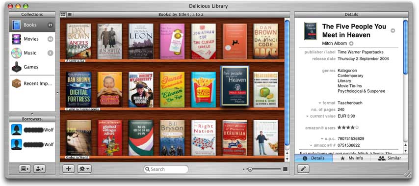 Delicious Library is a 11 MB download and universal binary. Once installed and opened this tool will greet you with a very neatly designed workspace, that should remind you of a bookshelf in the middle, to the left some categories (Books, Movies, Music, Games) and a list of “borrowersâ€. To the right is a section, which serves as data entry point, information screen and bookshop.