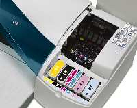 Print quality is very impressive. Using a Pantone guide, color accuracy seems spot-on. Also impressive is the ease of which the user can swap-out the ink in the system, lifting a simple transparent plastic door to access the printheads. Nice.
