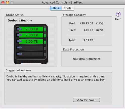 When you create a Time Machine share, you are asked for a maximum size for Time Machine, and this cannot be changed afterward. This is, according to the Drobo help site, to ensure you backups are safe. Another reminder the company offers is that Apple does not support third party network attached devices for Time Machine backup. So if you get into trouble, you’re on your own. But so far, I have not seen any issues using Time Machine with my Drobo FS. You won’t be able to boot from an OS X disk and restore from your Time Machine backup.