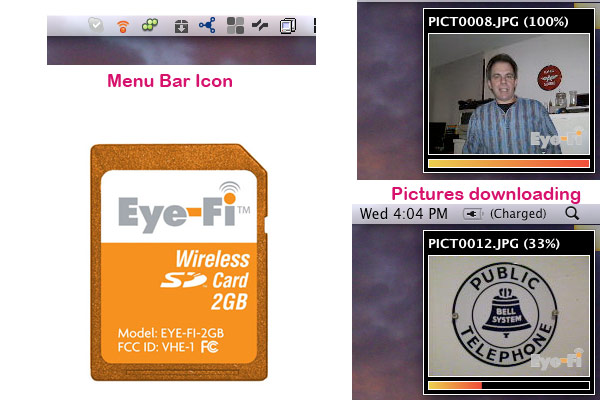When not in range of a usable WiFi, images are stored on the card as would be expected with any SD card. They can, of course, be copied at any time to your computer using the included USB reader if desired. However, if left on the card, when it does come within range of a usable WiFi access point, it will batch send all the photos that have yet to be sent. As the images transfer to your Mac, you will see a small window pop-down in the upper right hand corner, and a thumbnail image and download progress meter will appear. Also, the small Eye-Fi icon n the menu bar will also animate to indicate it is receiving photos. (See picture above)