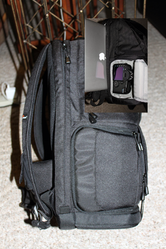 Moving forward from the computer compartment, what I consider to be the greatest selling point of this backpack, is the side access camera compartment. The intelligent design of this compartment really sets the Lowepro products which utilize this feature, apart. The previously mentioned front flap provides a guard against opening the side access too far and dumping your expensive camera equipment onto the not so friendly ground below. The side access opening was designed to allow you to easily slip the backpack off the right shoulder so that the backpack may then slide under your left shoulder. With the backpack still anchored by the left shoulder strap, you may easily access your camera for that quick picture opportunity. You can then easily secure your camera back within the backpack, slide it back over both shoulders, and done.