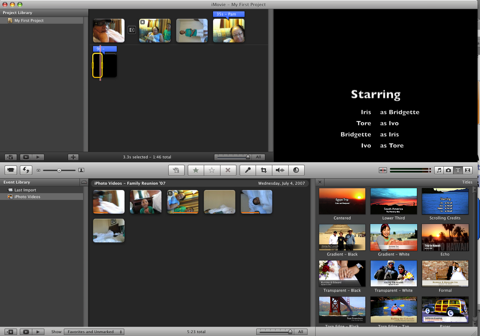 The number of transitions and title selections are fewer than what you get in iMovie ’06. Third-party transitions and titles are not yet supported, but hopefully that will be worked out in the next few months.
