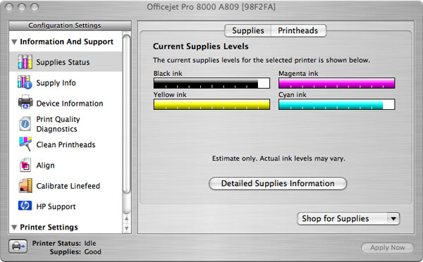 The HP Printer Utility is accessible over any of the HP OfficeJet Pro 8000’s three interfaces and provides ink level status as well as cleaning and alignment options. There’s even a Dashboard widget to monitor ink levels without needing to launch the Utility, another of HP’s thoughtful nods to Mac users.