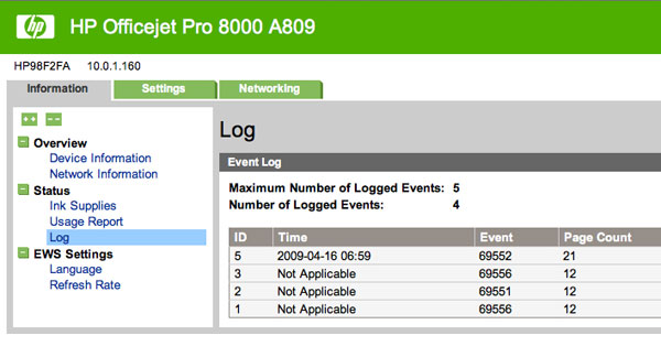 As far as the printer utilities and management are concerned, the HP Printer Utility (used for diagnostics, printhead cleaning, alignment and calibration) is quite capable and works just as well over the wireless connection as it does over USB or Ethernet. The 8000 also features a Bonjour-enabled Web interface, which means that the printer’s status, info and settings are available via Safari just by going to the Bookmarks menu and perusing the Bonjour bookmarks list for the OfficeJet Pro 8000. That sure beats frantically printing out various configuration pages trying to figure out what the printer’s IP address happens to be at the moment, and it shows that HP kept Mac users in mind when it engineered the 8000.