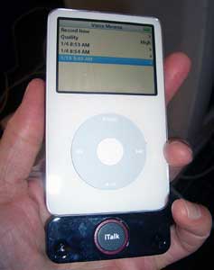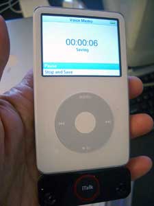 • Remove cute little black gizmo from its package, pry off plastic cover for iTalk Pro’s iPod generic 30-pin connector, insert iTalk Pro into your latest-model (5th generation) iPod with video or (2nd generation) iPod nano, wait a couple of seconds, press iTalk button in the center of iTalk Pro, and start speaking.