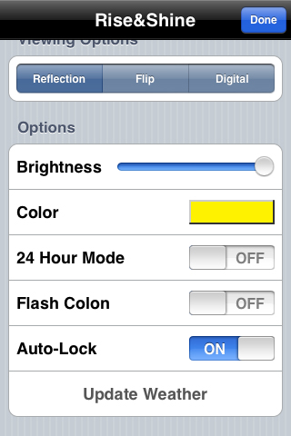 The app has several settings for color, screen dimming, and style of clock. To set an alarm, you use your iPod Touch/iPhone clock. Not sure I like that? I’d prefer to set everything up within the Rise&Shine app.