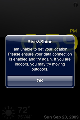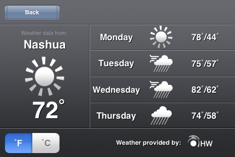 Press on the weather icon and you get the local five day forecast. I had problems with this feature. Since I have an iPod touch, I would frequently see the screen below.