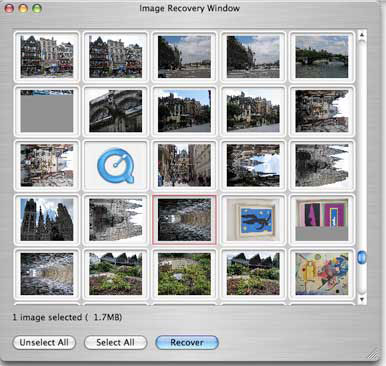 Once the photos have been recovered, all of them will appear as thumbnails in the Image Recovery Window. You can then click on Select All or Unselect All. But if you only want to recover three or four photos, you can also select individual images by holding down the Command button and clicking once on the mouse. Repeat that process for each photo you want to recover. The program then brings up the Finder window and you can select a folder where you want to store the recovered photos, or create a new folder.