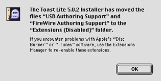 I studied the installer CD’s useful ReadMe document, then installed Roxio’s Toast Lite v5.0.2, which is offered in English, French, German, and Japanese. Another helpful ReadMe was part of the Toast Lite installation process, which placed application, extensions, help, and audio extraction items onto the hard disk of my iMac DV, and relocated a couple of existing Apple extensions. Restart.