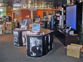 What makes this store so different from the looks of Apple’s stores or CompUSA? Wide open aisles, a big selection of iPod accessories, a knowledgeable sales staff that seems more interested in you getting what you need than making a sale, a pro audio section with microphones, pre-amps, midi keyboards, and guitars all ready to try out. A library with most of what anyone needs, ready to be examined in large comfortable chairs with a cup of free coffee. A classroom where the fundamentals of the iLife suite as well as advanced photo manipulation and video editing classes are taught. A full service and repair department for those rare occasions when your Mac goes south on you.