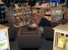 He showed me the classroom where six Mac minis were set up. Each had a full 1 Gb of RAM for better performance. He also took me through the repair shop where at least 10 Macs of various vintages were awaiting repair from their trained technicians. While he was happy there was no Apple Store close by, he admitted that they were constantly changing the store to meet any future challenge if one should open nearby. Ken is an old timer as far as Apple products go. He started with an Apple II + back in 1979 and his first Macintosh was a Performa 630. Several times while we were talking, he would have to quickly take a telephone call or stop to answer a customer’s inquiry. While I was there, several customers came in with various Macintosh or iPod related questions and needs, and not one of them went away without the exact product required or question unanswered. Many others came in and perused the book section, sitting down in one of the several chairs and reading one of the many Mac or iPod related books on display. They didn’t all make purchases, but you can bet they would be back.