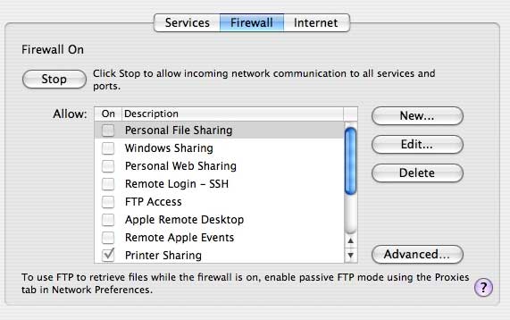 Once you have the two pieces of software downloaded and installed on the hard drive, there is one more setup step to do on SickMac. You need to disable the firewall or open port 5901. To do this go to System Preferences from the Apple Menu. Choose Sharing. Click Firewall. The easiest thing is to turn off the firewall by clicking “Stop.†You just have to remember to turn the firewall back on when you are finished.
