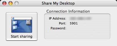 If these specifications are met, you are ready for the software. The computer that you will be connecting to (I’ll call this SickMac) will need a piece of software call “Share My Desktop.†It is available at http://www.bombich.com/software/smd.html. The computer connecting to the other computer (I’ll call this ControlMac) will need something called “Chicken of the VNC.†Download this here: http://www.bombich.com/software/smd.html.