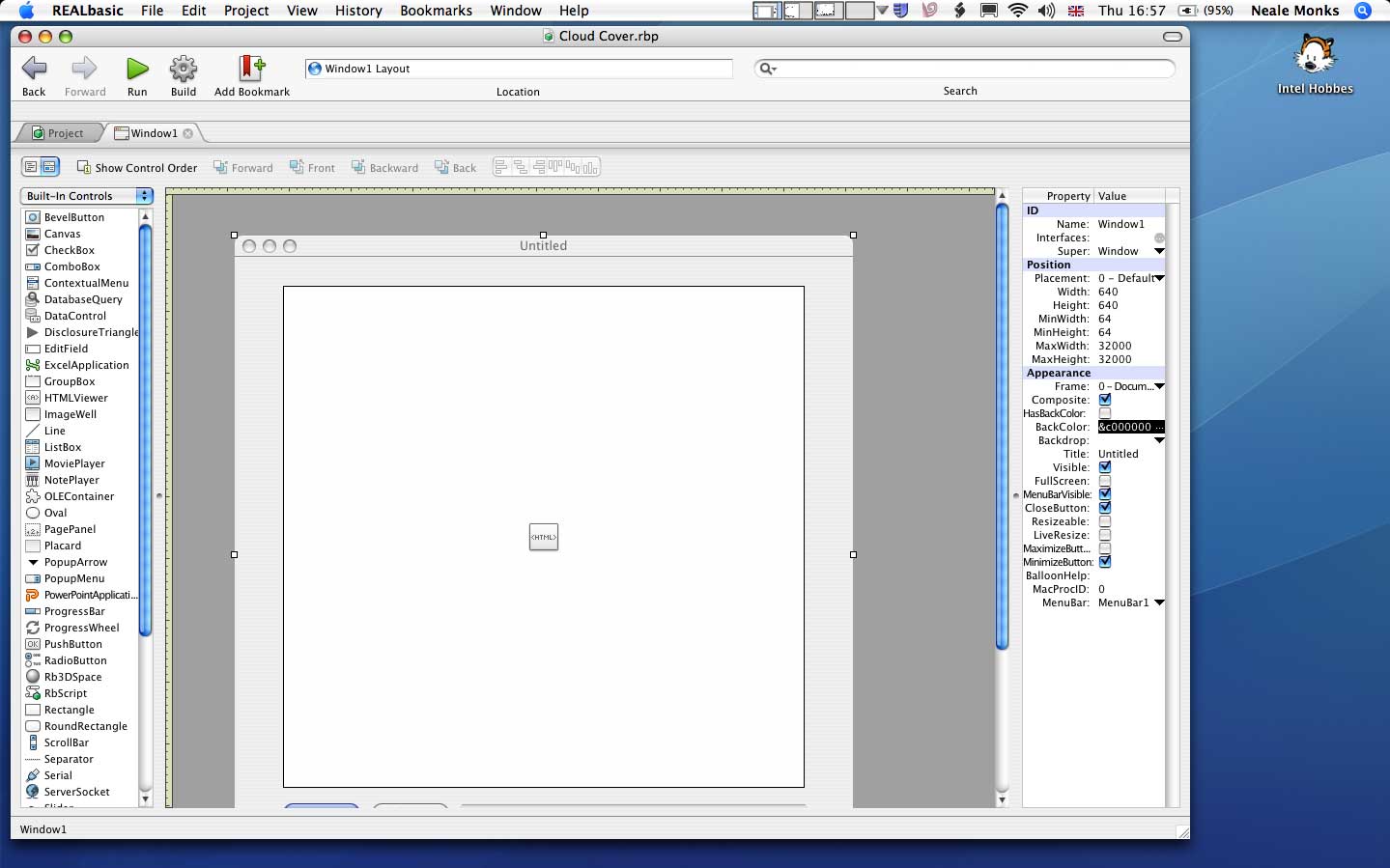 The Project window contains the overall settings, such as what platforms the program will be built for and what the application will be named. Within the Project window you will see three items running down the left hand side, App, Window1, and MenuBar1. Each of these contains different pieces of the application. The App window will contain things used by the entire application; Window1 just those things used in the main application window and nowhere else; and MenuBar1 things slotted into the main menu bar at the top of the screen.