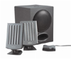 The PM9’s are a three-piece speaker system, consisting of two desktop flat-panel speakers as well as a subwoofer that sits on the floor. Aesthetically speaking, they are very nice looking speakers. The silver desktop speakers are set at a slight angle, so that the speakers face upwards rather than straight out. The speaker grills are metal, and each desktop speaker is actually quite weighty. This is good, as they will not tip over easily, nor accidentally moved out of your preferred listening location.