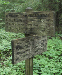 As the terrain began the steep rise that winds the path upward a crossroads trail signs prepared us for the abandonment of the current languor of brisk walking. Mt Cammerer 5.2 miles. It never sounds very distant at first, but once the grade takes hold and the forest wraps the shroud of humidity and I take extra time with sidetrips and crosscountry forays and the camera…that bloody camera; the time gets to tickin’…