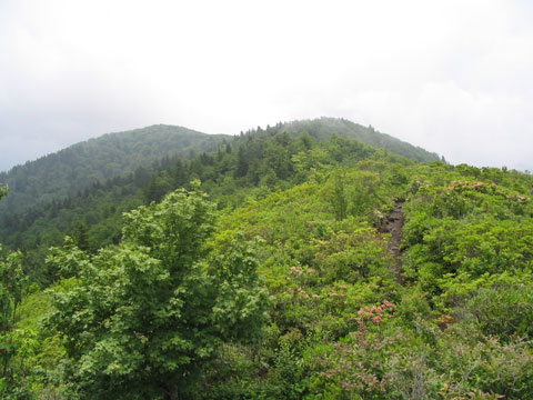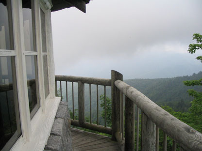 Still almost three miles to the tower and I couldn’t shake a group of gnats feeling the need to perform kamikaze dives into the corners of my eyes. Thankfully nary a single little bugger struck ocular paydirt, else I would have trudged the next few miles with what would have felt like a canoe rolled into the recess of my eye. My shirt was drenched with sweat from the burdensome humidity. Northward a bank of clouds began easing in and we were enveloped in a white mist – cloudwalking the AT in an ethereal shroud of what was likely an acidic haze of pollution, for the Great Smoky Mountains are unfortunately one of the (actually I think THE) parks most burdened with pollution. Has to do with prevailing winds sweeping southward from Pennsylvania and Ohio carrying noxious air pollution from the industrial matrix thereabouts; once it all hits the Tennessee valley the mountains shore up as a natural barrier to hold it in place, doing themselves in at the same time. They say the clouds that float the highlands are like vinegar – overly enriching the nitrogen content of the soil and causing an accelerated erosion of the diverse flora and fauna. And it’s only getting worse.