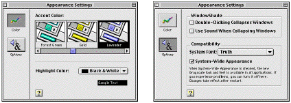 The options part of the control panel lets you control the WindowShade feature, set your System font, and lets you define whether or not you want the grayscale appearance throughout the system. You can still set that little “zip” sound for WindowShade, and you can still double click the menu bar, if you want. System font choices are “Truth” and “Chicago,” although you cannot control the size. See screen shot above.