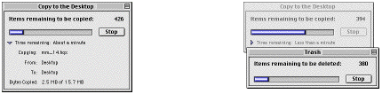 While copying, you can now view critical information about the copy, including time remaining, bytes transferred and left to transfer, the name of the file being copied, and to and from where the copy is taking place. If you’re copying a folder, a small icon appears in the window header, telling you that the file is being copied (the delete dialog box has not changed from the one in 7.6, aside from the new appearance). Window updating is shown by a small turning arrow in the window header, and this also happens in the background.