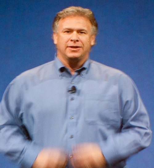 MyMac’s Tim Robertson could not contain his thrilled excitement at the prospect of Phil Schiller taking to the stage. I amazed he was sat still long enough for Nemo to get this picture.