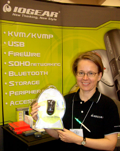 Paivi from IOGEAR holds a new mouse covered with material that is supposed to prevent bacteria or nasty germs from residing and passing on infection. Do you think it will do this mysterious task as well once it’s out of their impenetrable shrink wrap?