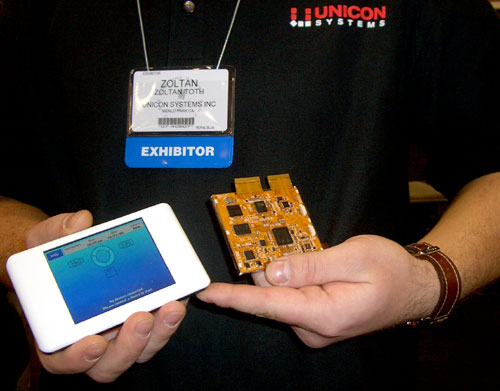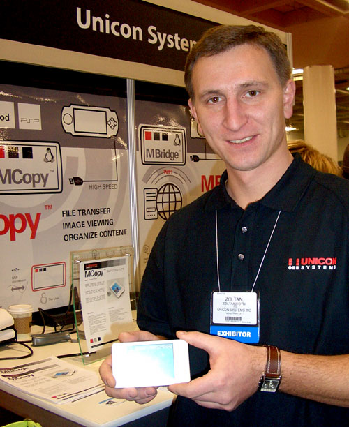 Zoltan holds MCopy, UNICON SYSTEM’s innovative high speed USB transfer device for copying data, music, images, and videos from any card or drive to any other. It’s tricky to explain, but very easy to use. Watch MyMac.com, and we’ll try to get a unit for a video review. For a guy from Menlo Park, Zoltan has the best fake Ukranian accent you’ve ever heard. You’ll hear it when we interview him.