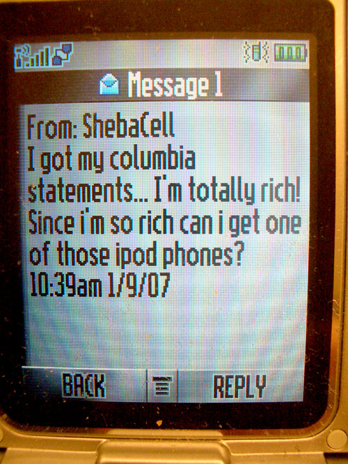 My daughter sent me this text message as soon as iPhone was announced. I felt a buzz in my pocket, and burst out laughing when I read her request. Sheba works hard, is financially secure, in her 30s, and in no need of permission from Dad. Her mutual fund statements gave her a few hundred more dollars (on paper) than she had a year ago. When my daughter is an early adopter, like she was with Apple’s v.1 miniPod, you can bet your mutual fund dividends the product is going to succeed. “Sure, Sheba. May I borrow it, please, as soon as you sign up for your supercharged Cingular data contract?”